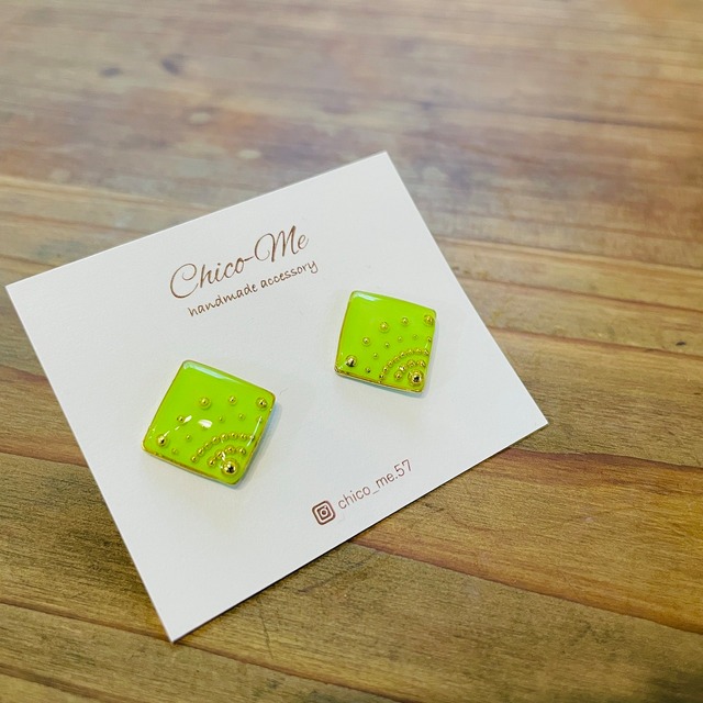 【ピアス / イヤリング】ドットアート - square - (ゴールド×イエローグリーン)