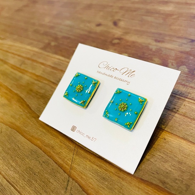 【ピアス / イヤリング】ドットアート - square - (ゴールド×ミントブルー)
